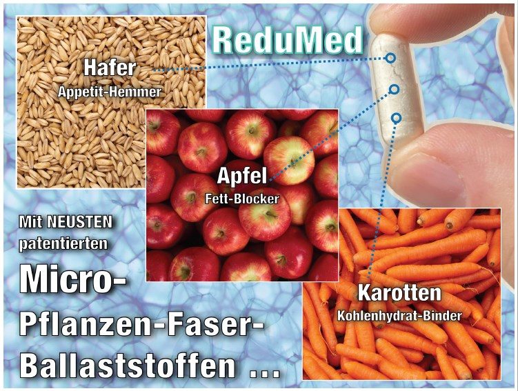 Der Inhalt in den Kapseln besteht aus patentierten Micro-Pflanzen-Faser-Balaststoffen, sie werden aus natürlichen ÄPFEL, HAFER und KAROTTEN mit spezieller Technology hergestellt. Das wirkt im Körper nicht chemisch, sondern rein biologisch und schonend. ReduMed ist ein geprüftes Medizinprodukt hergestellt für die Schweiz.